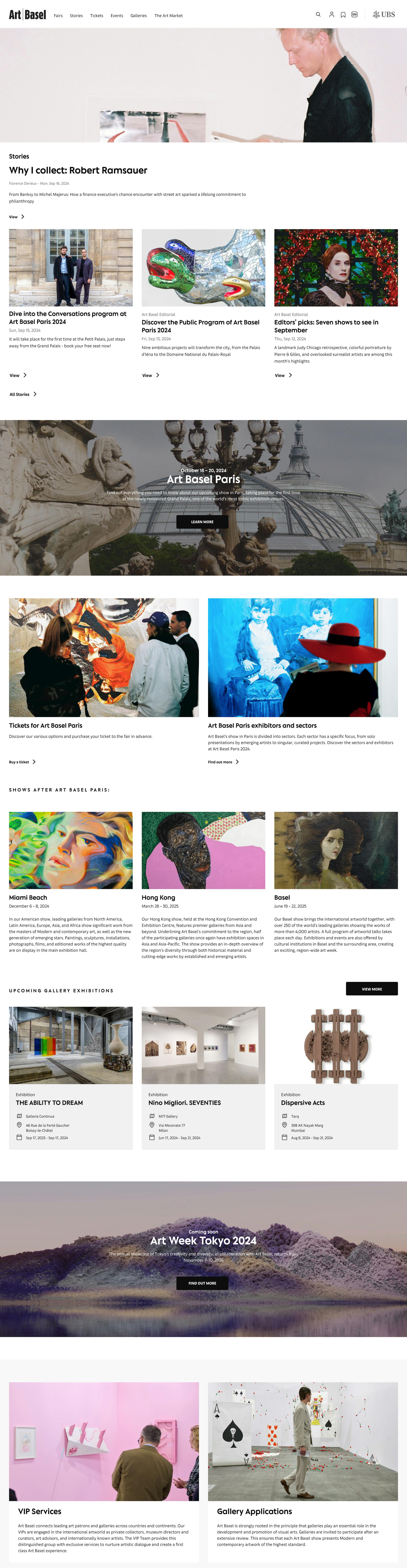 Founded by gallerists in 1970, Art Basel is the leading global platform connecting collectors, galleries, and artists. Art Basel's fairs in Basel, Hong Kong, Paris, and Miami Beach, as well as its Online Viewing Rooms, are a driving force in supporting galleries as they nurture the careers of artists. Our publication The Art Market , co-published with our Lead Partner UBS, is a commitment to increasing the transparency of the art market. Art Basel's Initiatives strive to create unique artist-led experiences and strengthen local art scenes.