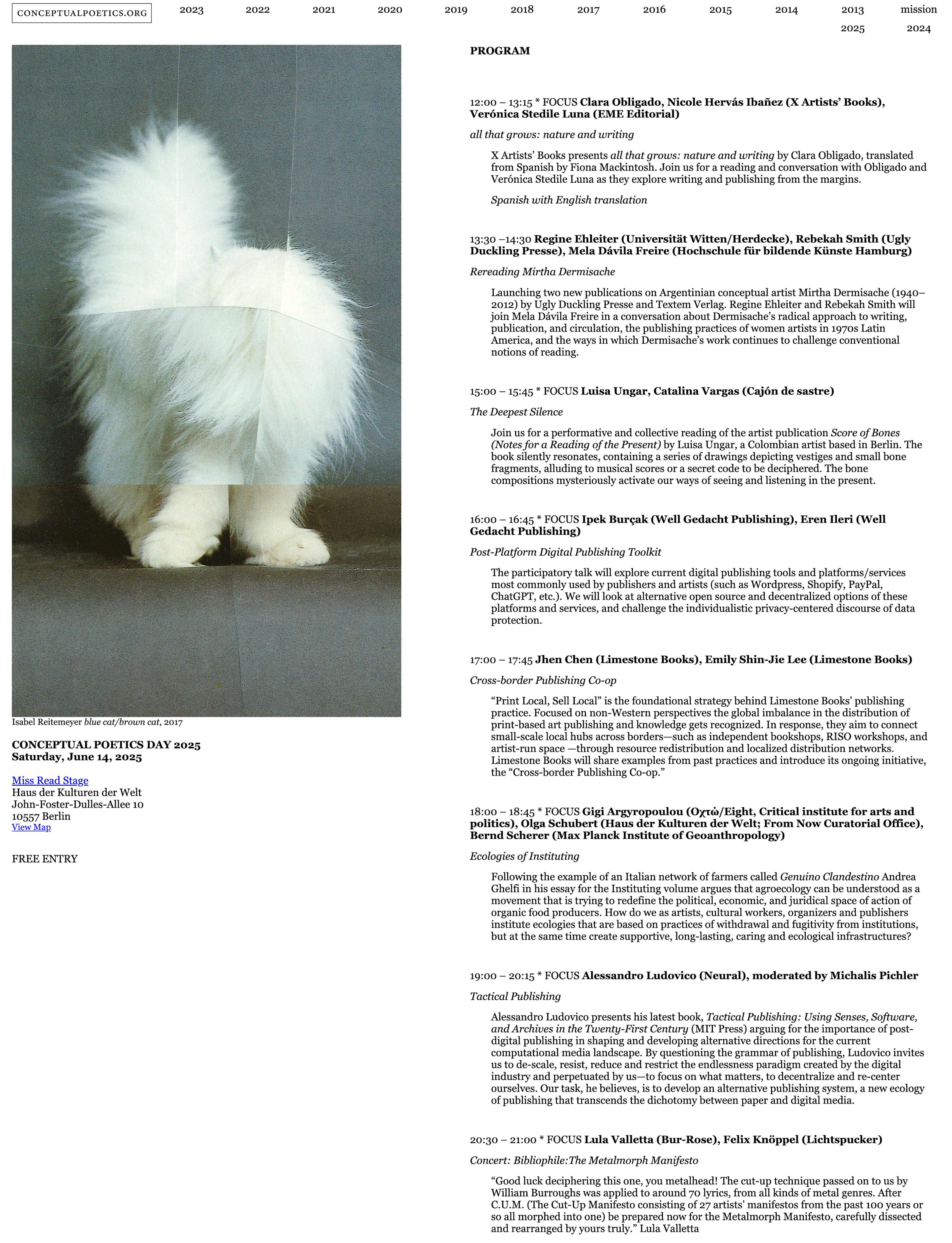 The CONCEPTUAL POETICS DAY is an annual event that explores the imaginary border between visual art and literature.