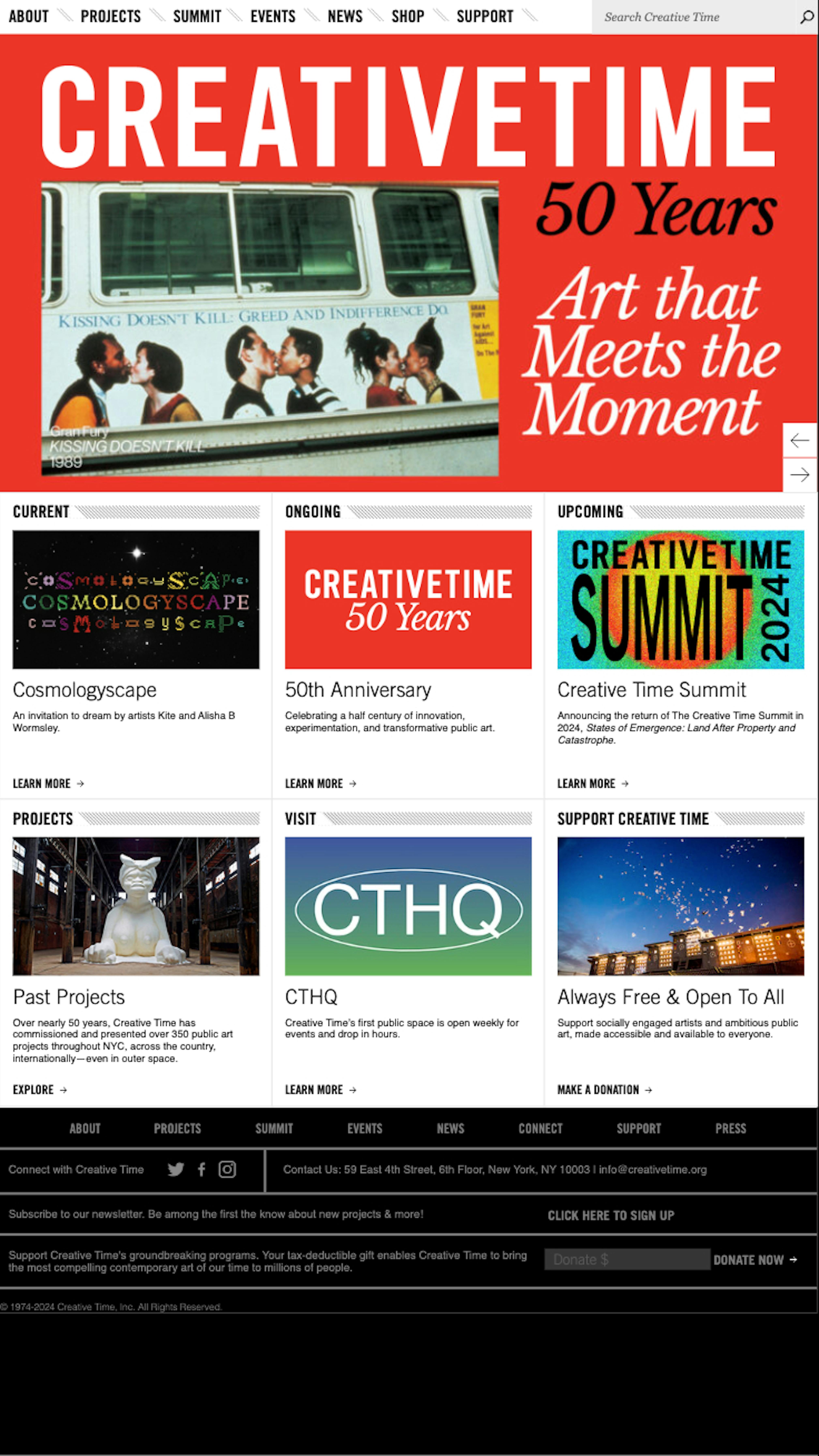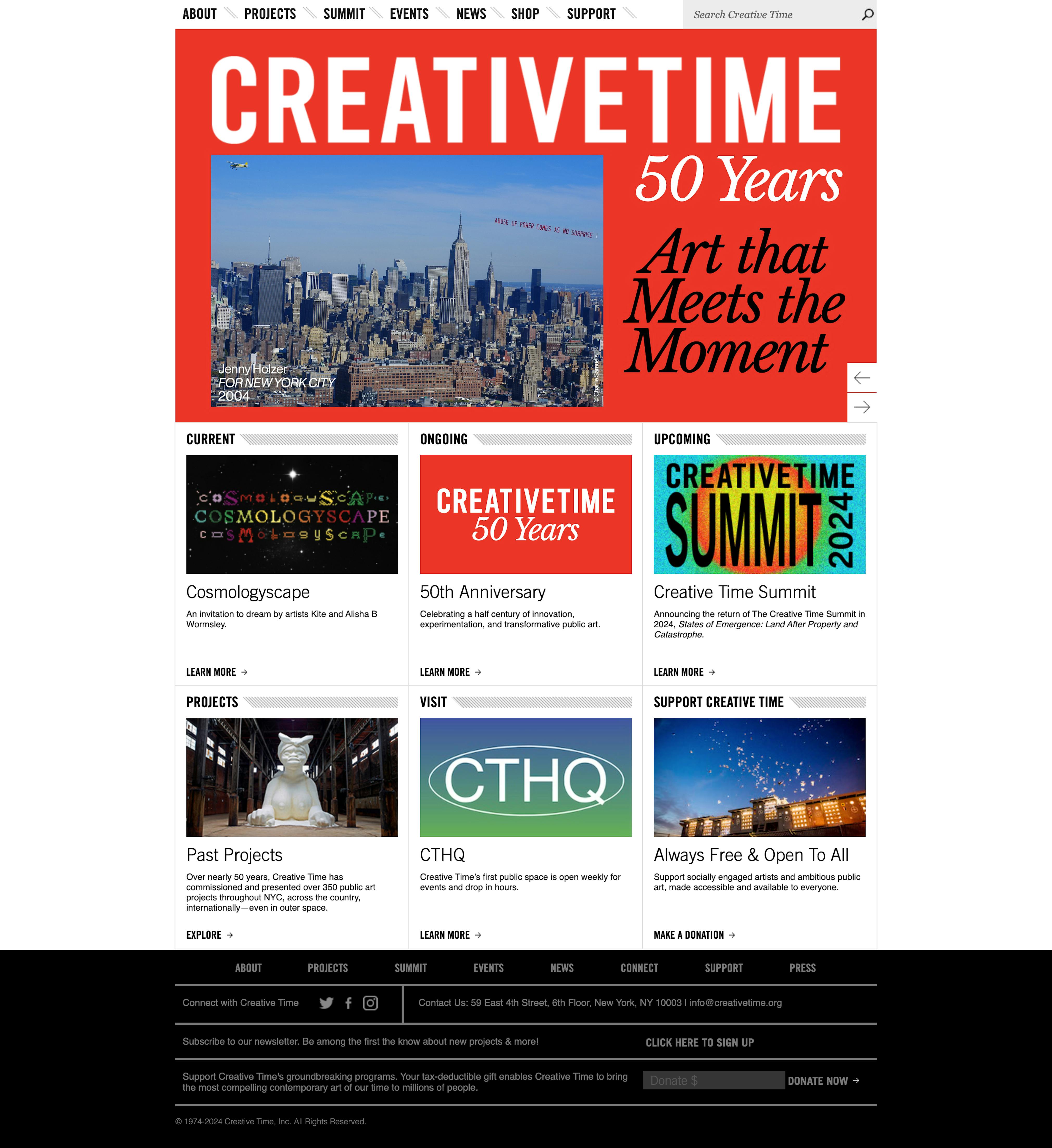 Since 1974, Creative Time has commissioned and presented ambitious public art projects with thousands of artists throughout New York City, across the country, around the world—and even in outer space. Creative Time is guided by three core values: art matters, artists’ voices are important in shaping society, and public spaces are places for creative and free expression. We are acclaimed for the innovative and meaningful projects we have commissioned, from Tribute in Light, the twin beacons of light that illuminated lower Manhattan six months after 9/11, to bus ads promoting HIV awareness, to Paul Chan’s production of Waiting for Godot in New Orleans, and much more. In partnership with a variety of well-known cultural institutions and community groups, we have commissioned art in unique landmark sites from the Brooklyn Bridge Anchorage, Times Square, Rockefeller Center, Governors Island, and the High Line, to neglected urban treasures like the Lower East Side’s historic Essex Street Market, Coney Island, and New Orleans’s Lower 9th Ward. We are committed to presenting important art for our times and engaging broad audiences that transcend geographic, racial, and socioeconomic barriers.