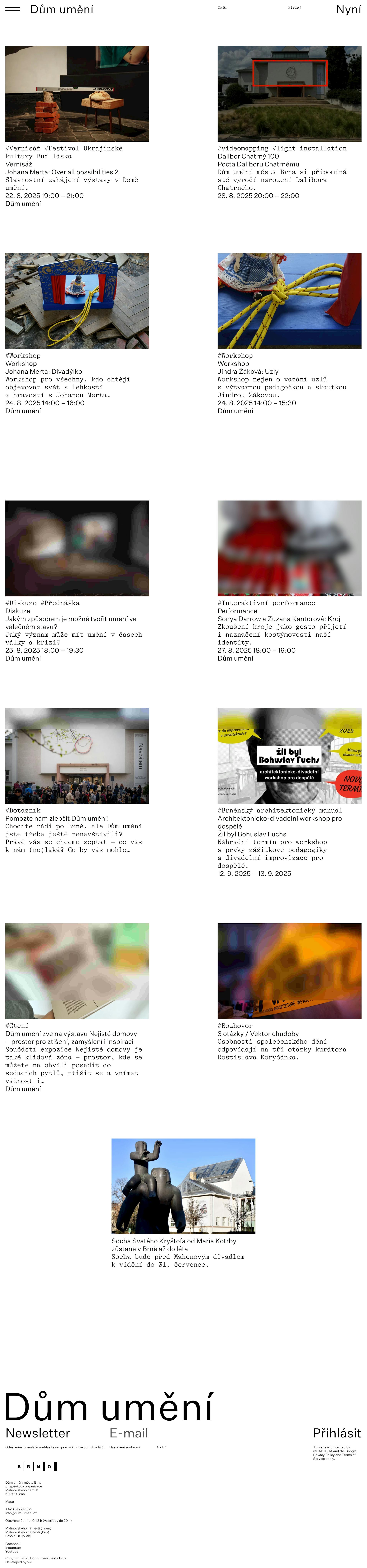 House of Arts Brno is a city gallery designed to present temporary exhibitions of contemporary visual culture. It acquaints the general public with art that is extraordinary in its results, uncompromising in its inner search and able to grasp profoundly significant and often complicated topics that appeal to present-day audiences. The activities of the House of Arts are based on the creative efforts of professionally educated employees who view their work as their mission and are devoted with extraordinary personal commitment. The democratic, non-manipulative approach to artistic creation and the resulting respect for the creative, artistic act is a necessary condition.