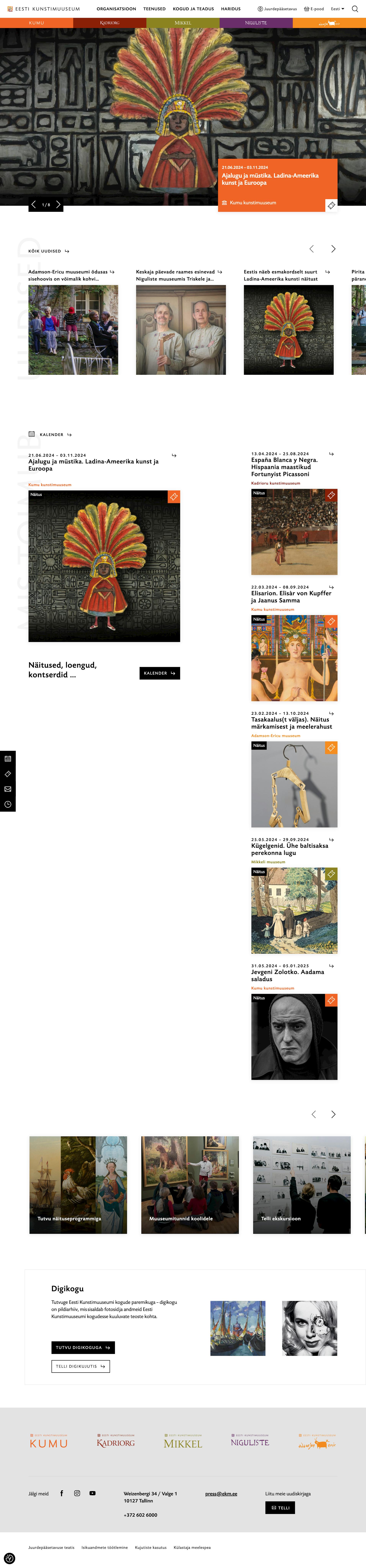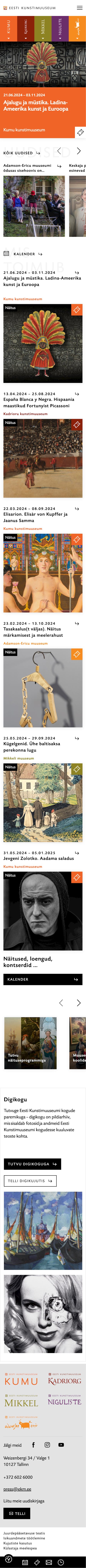 Historical ecclesiastical art from the Middle Ages up to the Baroque period is displayed in the Niguliste Museum, foreign art from the 16th to 20th century is displayed in the Kadriorg Art Museum, the art collection of Johannes Mikkel in the Mikkel Museum, the art of Adamson-Eric, a modernist Estonian artist of the 20th century, is displayed in the Adamson-Eric Museum, and Estonian art from the 18th century until today is housed in the Kumu Art Museum. The collection of the Art Museum of Estonia is constantly supplemented by earlier art, as well as by contemporary art.