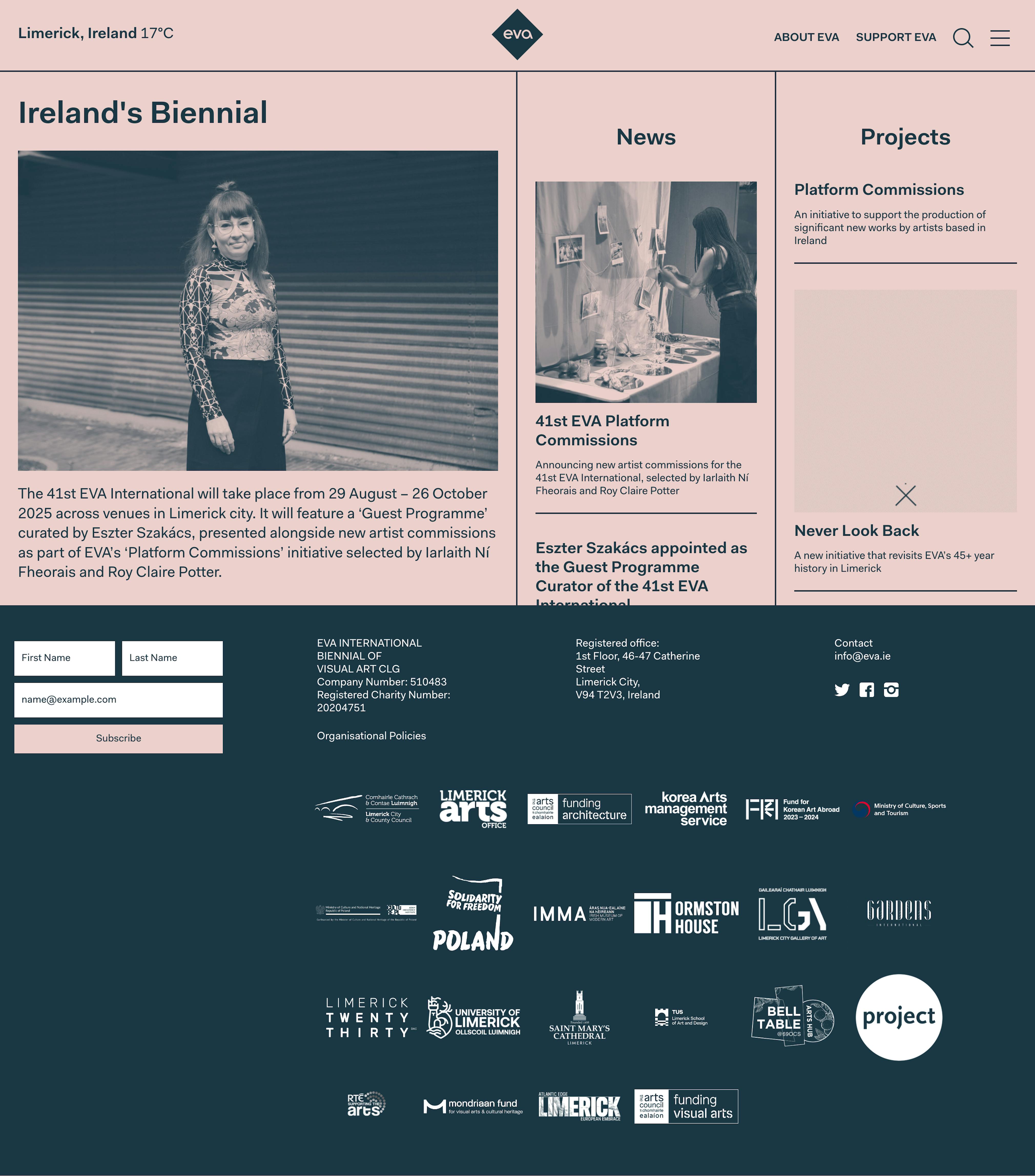 EVA International is Ireland’s Biennial of Contemporary Art. EVA leads in the commissioning and curating of contemporary art by Irish and international artists, culminating in a programme of artistic encounters, exhibitions, and education projects, that takes place every two years across venues in Limerick city and beyond. EVA’s vision is ‘To lead in creating experiences and encounters of world-class contemporary art that activate Limerick as a place of creative endeavour and cultural destination’.