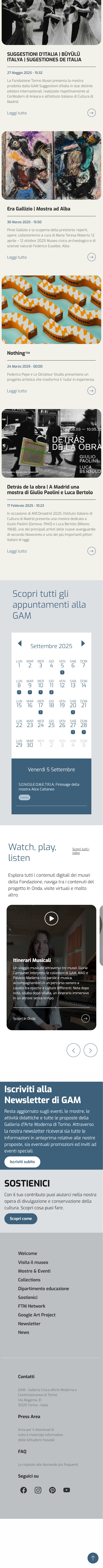 GAM offers the public a broad program of exhibitions with Italian and international artists that also address the most current contemporary research.