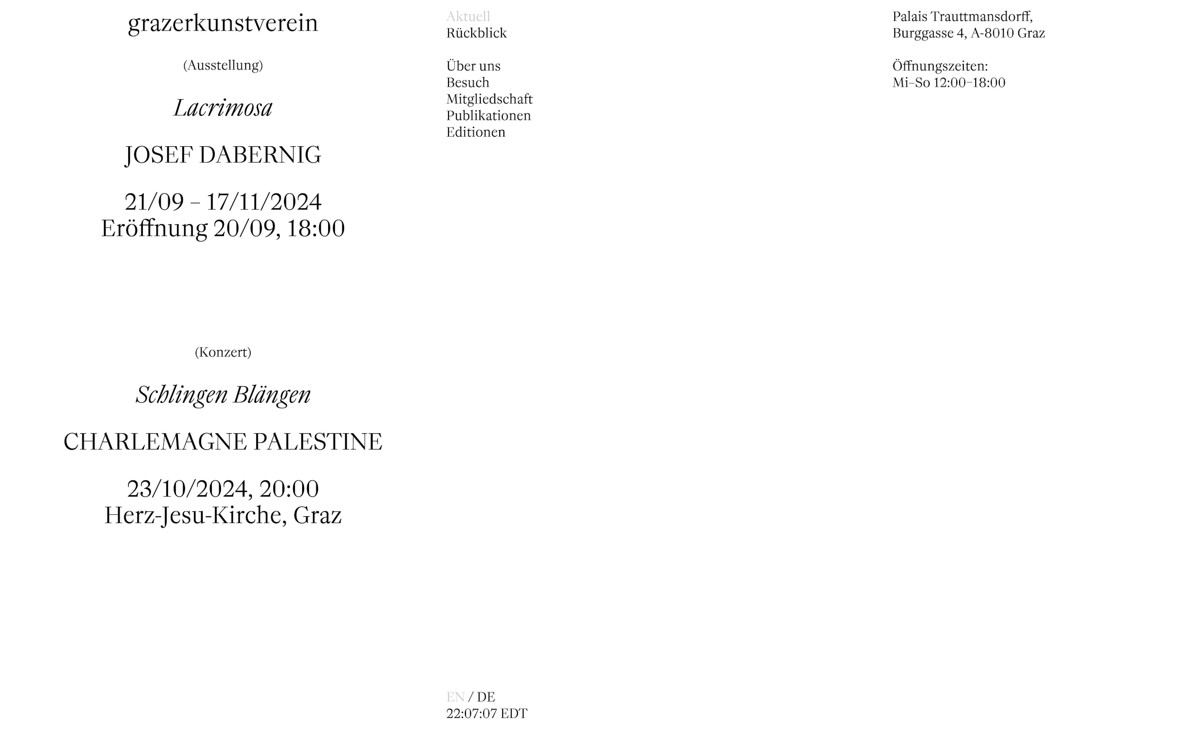 The Grazer Kunstverein is a non-profit, member-based arts organization located on the ground floor of the historic Palais Trautmansdorff in the center of Graz. Founded in 1986, the Grazer Kunstverein has developed a distinctive voice within Austria and operates in strong dialogue with international developments in contemporary art. Established as a space for artistic production, exhibition-making, and mediation, it has always resisted populist influences, instead advocating for the promotion and presentation of qualitative artistic experiments. The history of the institution itself is one of experimentation, risk-taking, and critical discourse. It, therefore, provides the context to rethink the role and function of a Kunstverein within contemporary conditions.