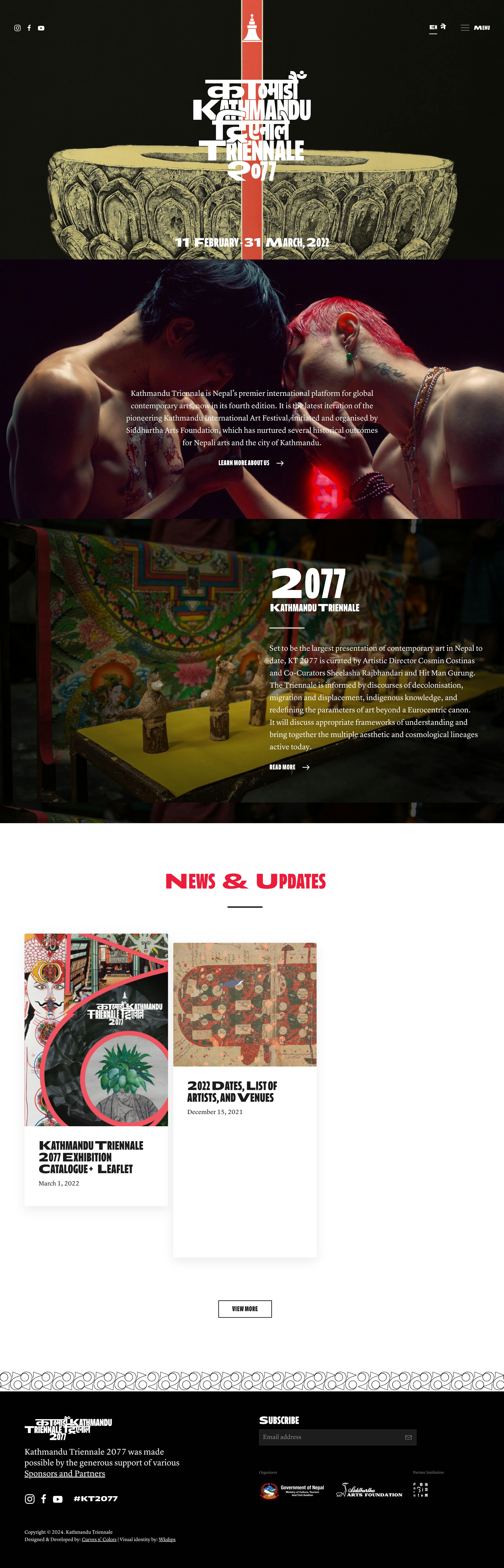 Kathmandu Triennale (KT), now in its fourth edition, which was previously branded as the Kathmandu International Art Festival, is Nepal’s premier international platform for global contemporary art. It looks to foster a healthy art ecology that is based on the exchange of knowledge through an expansive art exhibition as well as a robust educational and public outreach programme. The Triennale’s exhibition will be presented across five historically and culturally significant venues in three clusters; Patan, Kathmandu, and Boudha. There will also be a series of curated public programmes, including performances, workshops, lectures and an opening series of conversations, parallel to the exhibition. The exhibition includes over 100 artists, collectives and collaborators from more than 40 nations. The public outreach programmes are organised in partnership with various local and international institutions, presented throughout the duration of the Triennale project, which began with the monthly Nepal Art History Discussion Series initiated in October 2019, and KT2077 Kurakani virtual artist talk series started in June 2020.