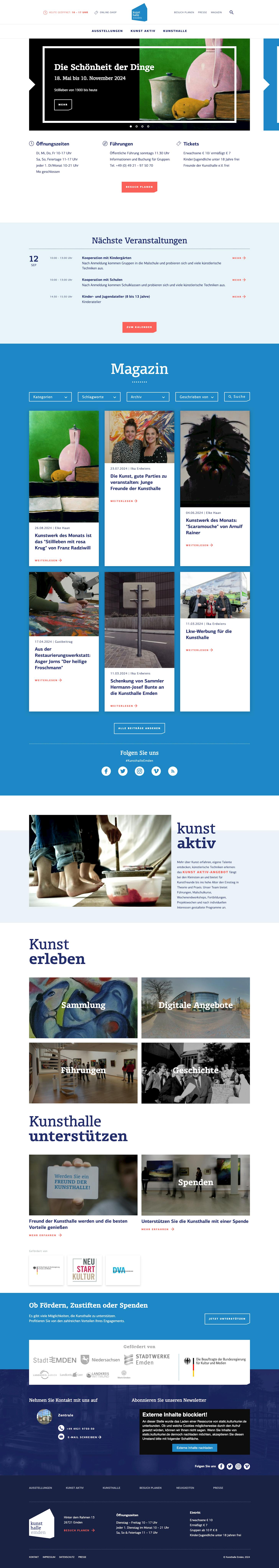 "A lively meeting place" between people and art: that was Henri and Eske Nannen's vision for the Emden Art Gallery. Otto van de Loo later also found his ideas reflected in it. The team at the art gallery has made this idea the guiding principle of its work. The many offers from "kunst aktiv" with painting school and museum education, the activities of the friends of the art gallery and also the constant development of the building, both inside and out, are all examples of this. See for yourself.