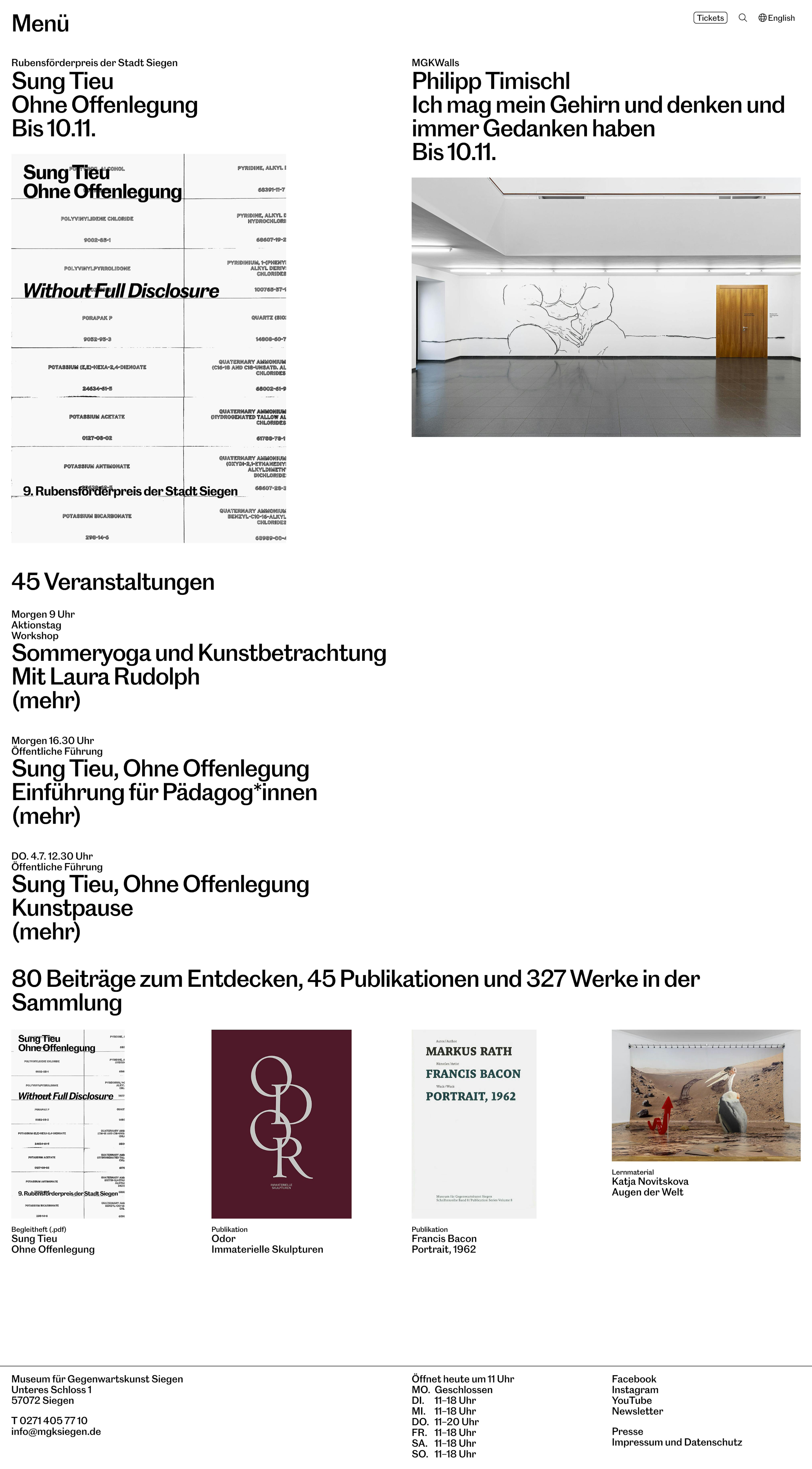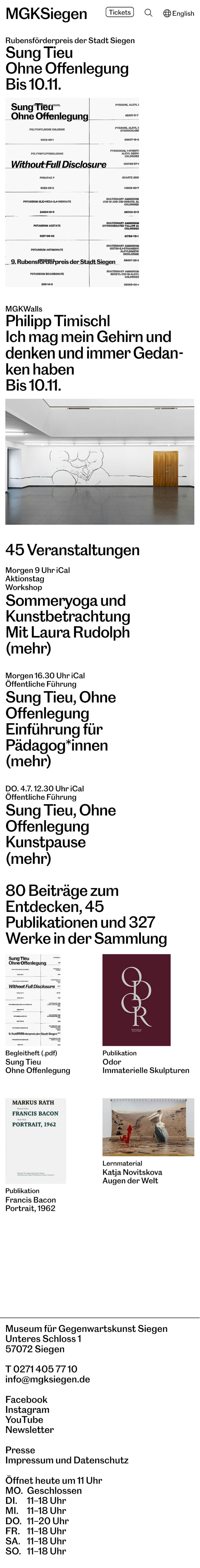 Since its opening in 2001, the Museum für Gegenwartskunst Siegen has operated as an internationally oriented art museum. Its exhibition programme, collection and wide range of educational opportunities mean that the museum offers its visitors fresh perspectives on contemporary art and its history. The MGKSiegen sees itself as an open museum awakening enthusiasm for current art production and also providing innovative impulses in research. As an important cultural beacon in the region of Southern Westphalia, closely linked to the city and the university, the museum is firmly anchored in the region’s cultural life.