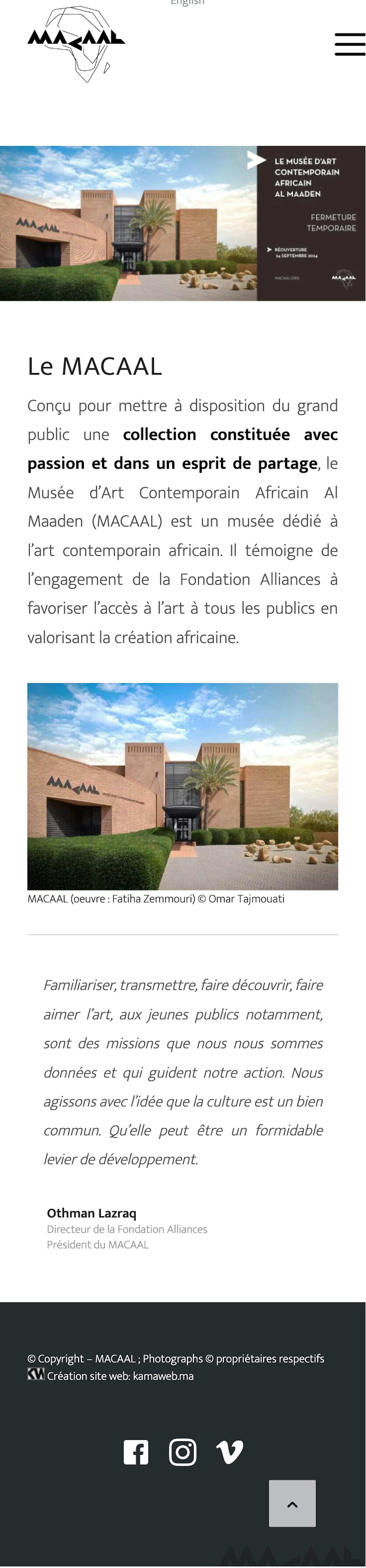 The Museum of African Contemporary Art Al Maaden (MACAAL) in Marrakech is an independent, not-for-profit contemporary art museum. One of the first of its kind on the continent, MACAAL is dedicated to the promotion of African art through its diverse exhibition and education programmes, cultivating the interest of a wide audience base. The museum nurtures an understanding of contemporary art from Africa through collecting and exhibiting established and emerging artists, highlighting the creative energy and cultural diversity found across the continent.