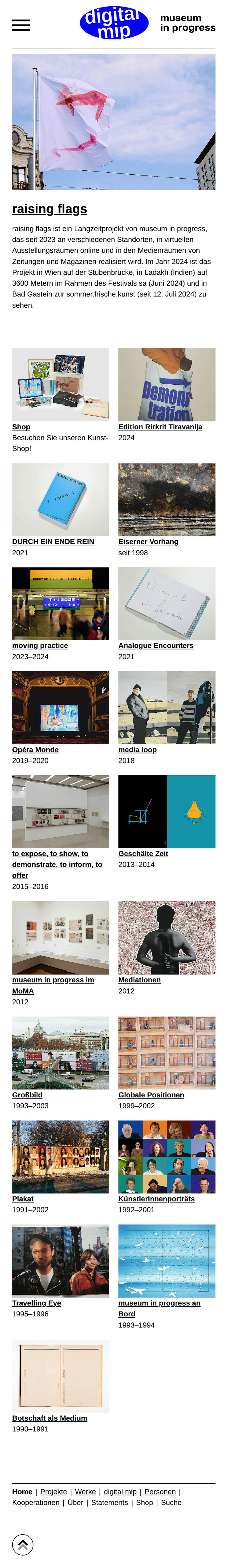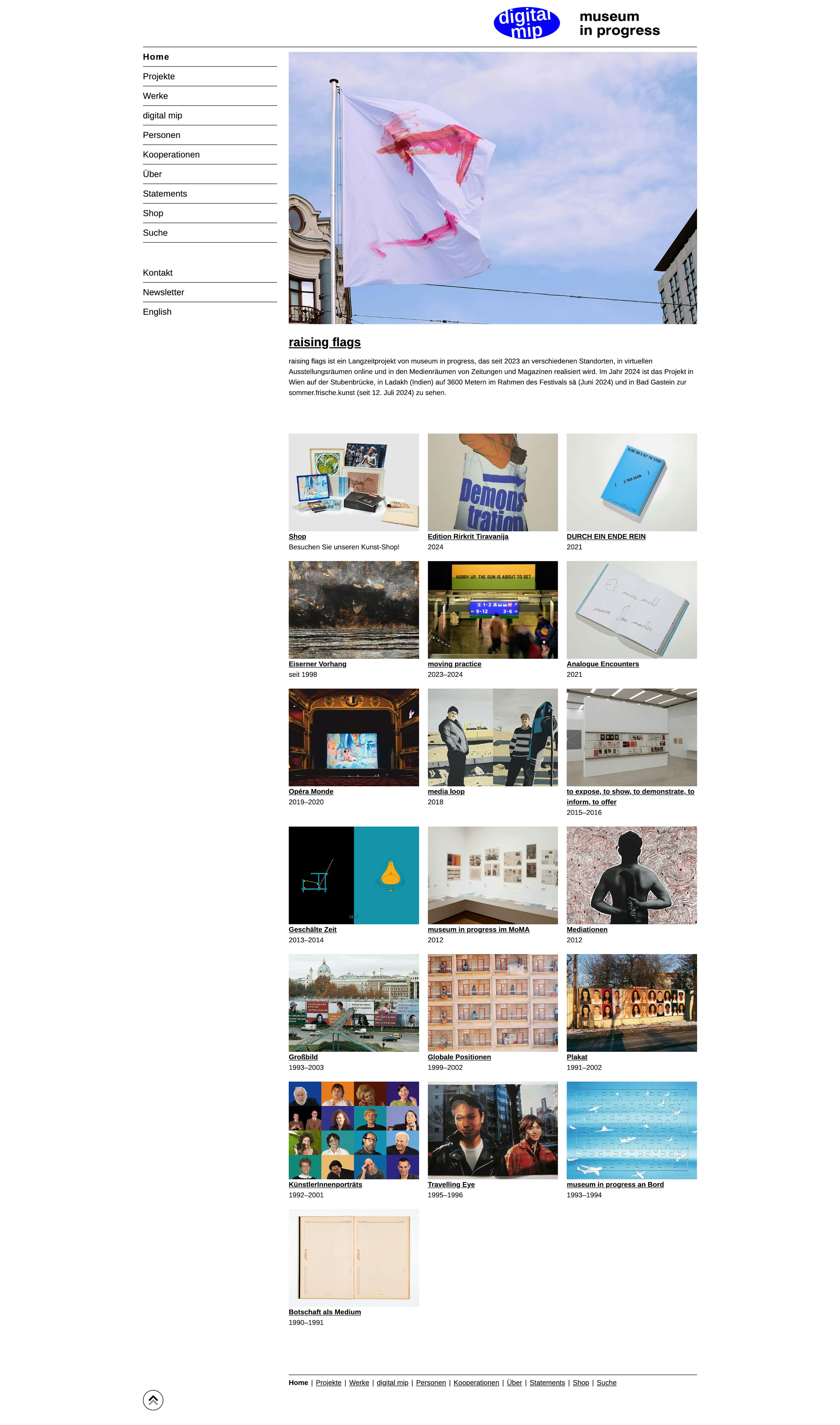 museum in progress is a non-profit art initiative that has set itself the task of developing innovative and contemporary forms of presentation for contemporary art. Since 1990, exhibition spaces have been opened under the "museum in progress" logo in various media, making contemporary art accessible to a broad public. The practice of museum in progress is media-specific, context-dependent and temporary. This applies both to individual projects and to the entire structure. An indispensable prerequisite for the activities of museum in progress is the independence of the artistic decision, which is protected by binding contracts with all cooperation partners. museum in progress addresses the public both for international contemporary art and for open social discourse. In this sense, museum in progress acts independently of political influence.