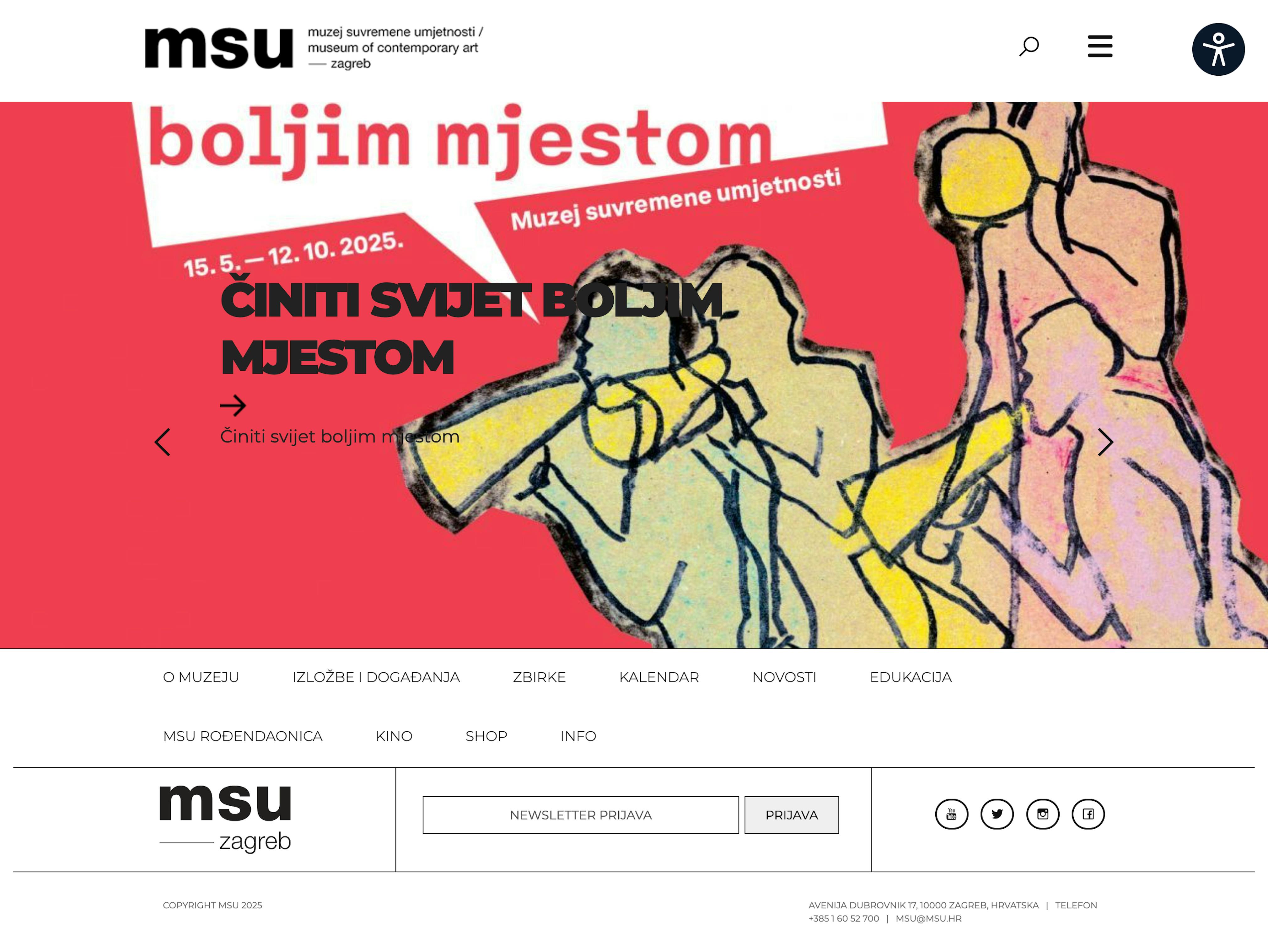 The Museum of Contemporary Art Zagreb is a vibrant place for the creation, exhibition, interpretation and preservation of contemporary art in all its manifestations. Its aim is to encourage and foster the understanding of contemporary art through the professional, innovative and educational use of exhibitions and collections, enabling the most diverse groups of visitors to learn, be creative and have a unique experience. As a multi-program institution, it mediates heritage and the contemporary scene, from visual to performing arts to film, thus making it an active and critical part of the community.