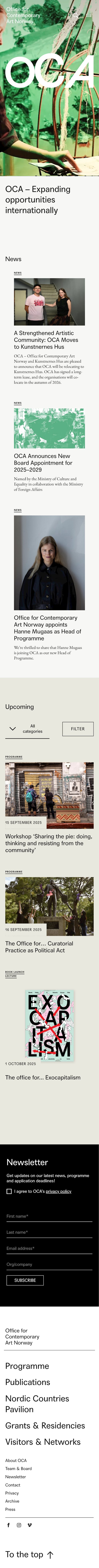 OCA - Office for Contemporary Art is a foundation promoting contemporary art from Norway internationally. OCA expands international opportunities and contributes to global exchanges through various activities, including grants and residencies, research visits and network development, public programmes, and publishing. OCA is funded by the Ministry of Culture and Equality and the Ministry of Foreign Affairs and is the commissioner for Norway’s contribution to the visual arts section of La Biennale di Venezia.