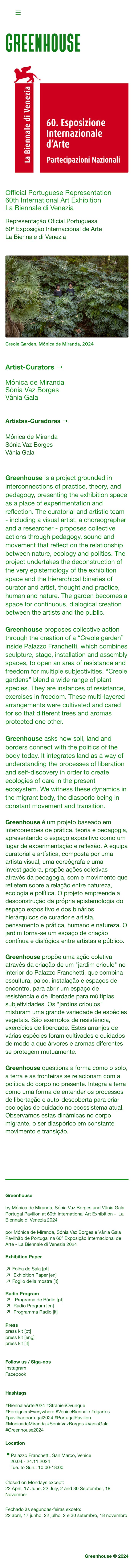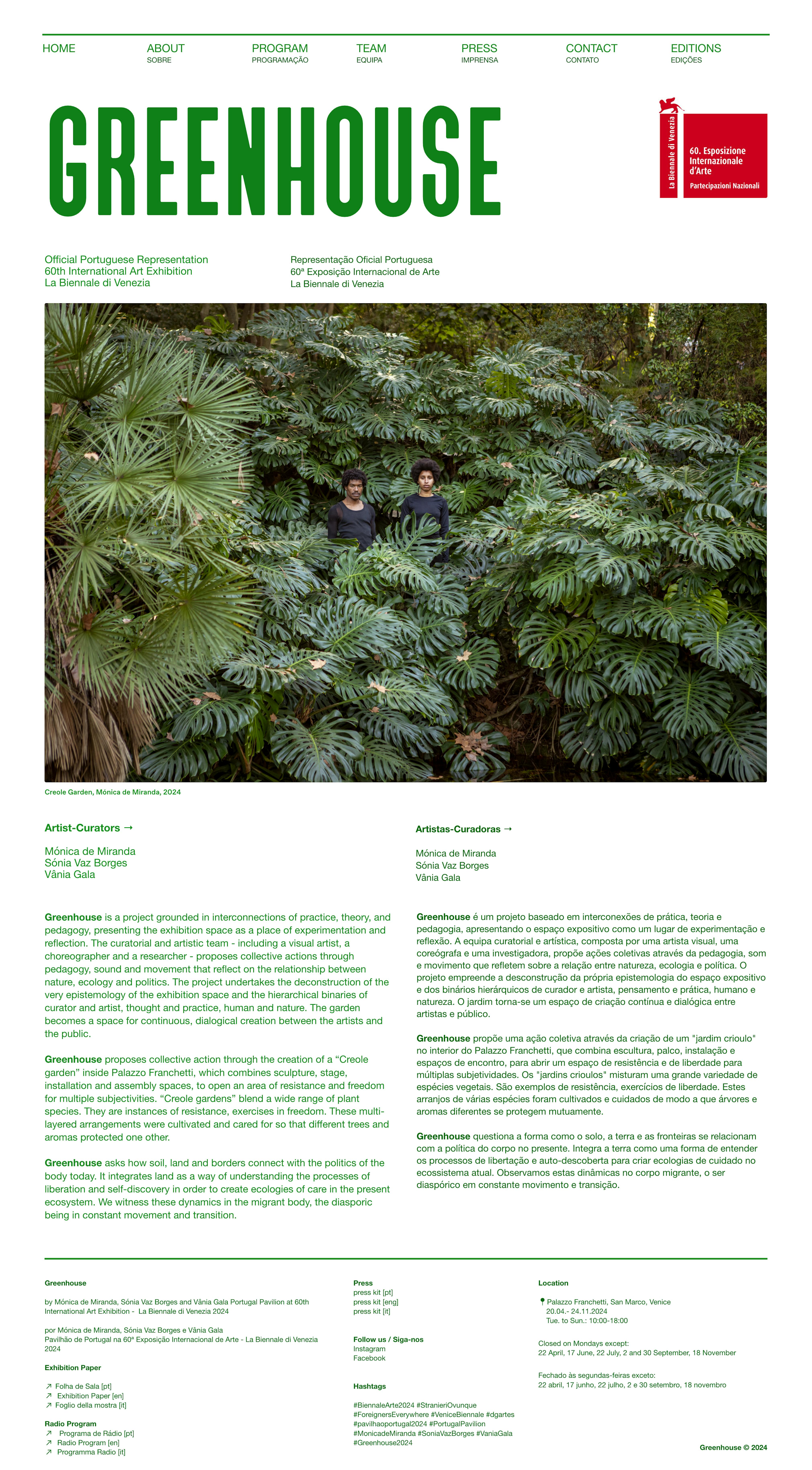 Greenhouse is a project grounded in interconnections of practice, theory, and pedagogy, presenting the exhibition space as a place of experimentation and reflection. The curatorial and artistic team - including a visual artist, a choreographer and a researcher - proposes collective actions through pedagogy, sound and movement that reflect on the relationship between nature, ecology and politics. The project undertakes the deconstruction of the very epistemology of the exhibition space and the hierarchical binaries of curator and artist, thought and practice, human and nature. The garden becomes a space for continuous, dialogical creation between the artists and the public. Greenhouse proposes collective action through the creation of a “Creole garden” inside Palazzo Franchetti, which combines sculpture, stage, installation and assembly spaces, to open an area of resistance and freedom for multiple subjectivities. “Creole gardens” blend a wide range of plant species. They are instances of resistance, exercises in freedom. These multi-layered arrangements were cultivated and cared for so that different trees and aromas protected one other.