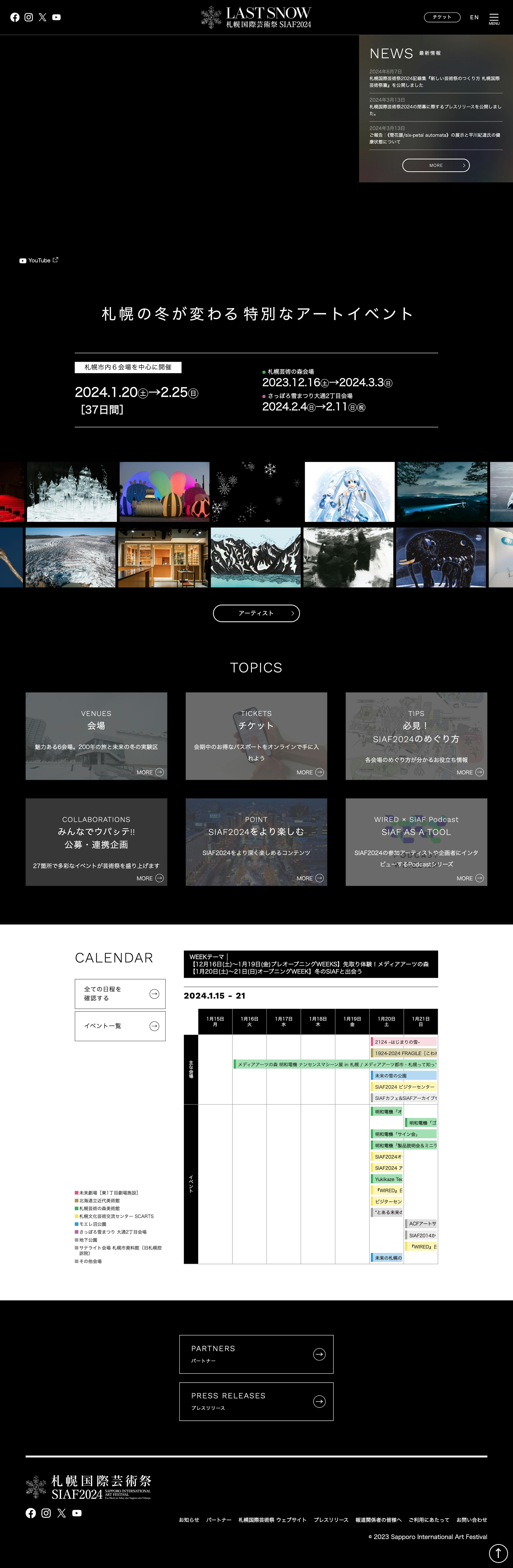 The theme of Sapporo International Art Festival 2024 is “Last Snow”. Humanity lives in the midst of constant crises, with events such as the global pandemic since 2020, division, conflict, and war. Technological development is accelerating, resulting in rapidly transforming societies. Furthermore, the effects of global climate change are slowly but surely changing our lives. It is predicted that by the end of the 21st century the meaning of “snow” – which should exist in Sapporo as a matter of course – and the scenery it creates will be different from what they are today.