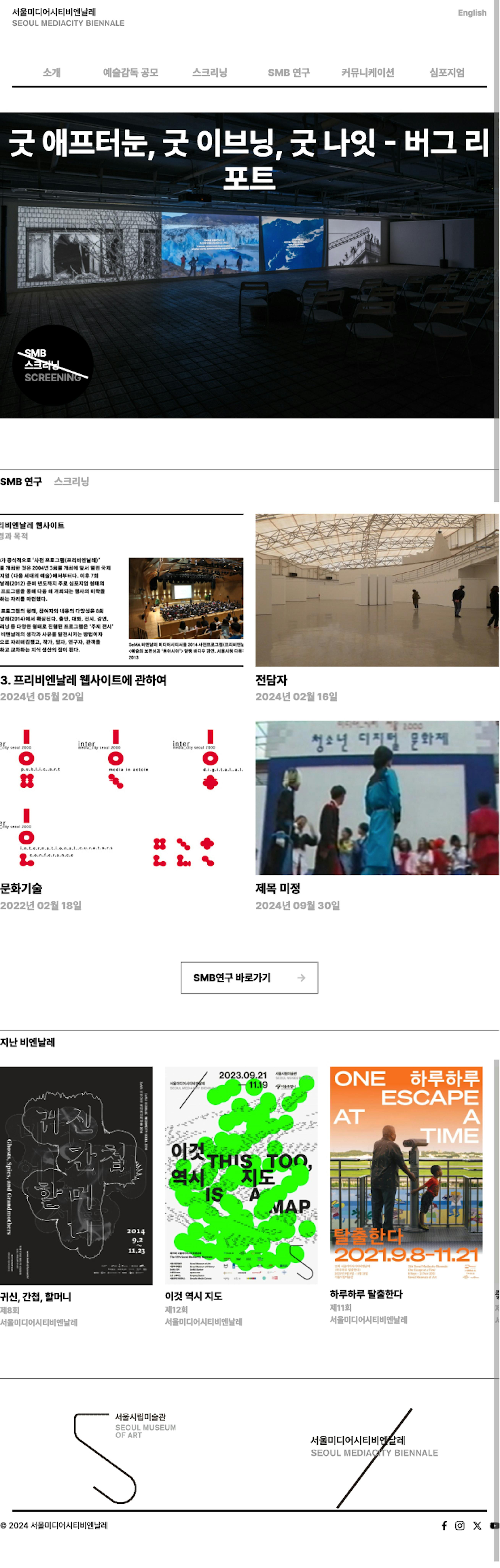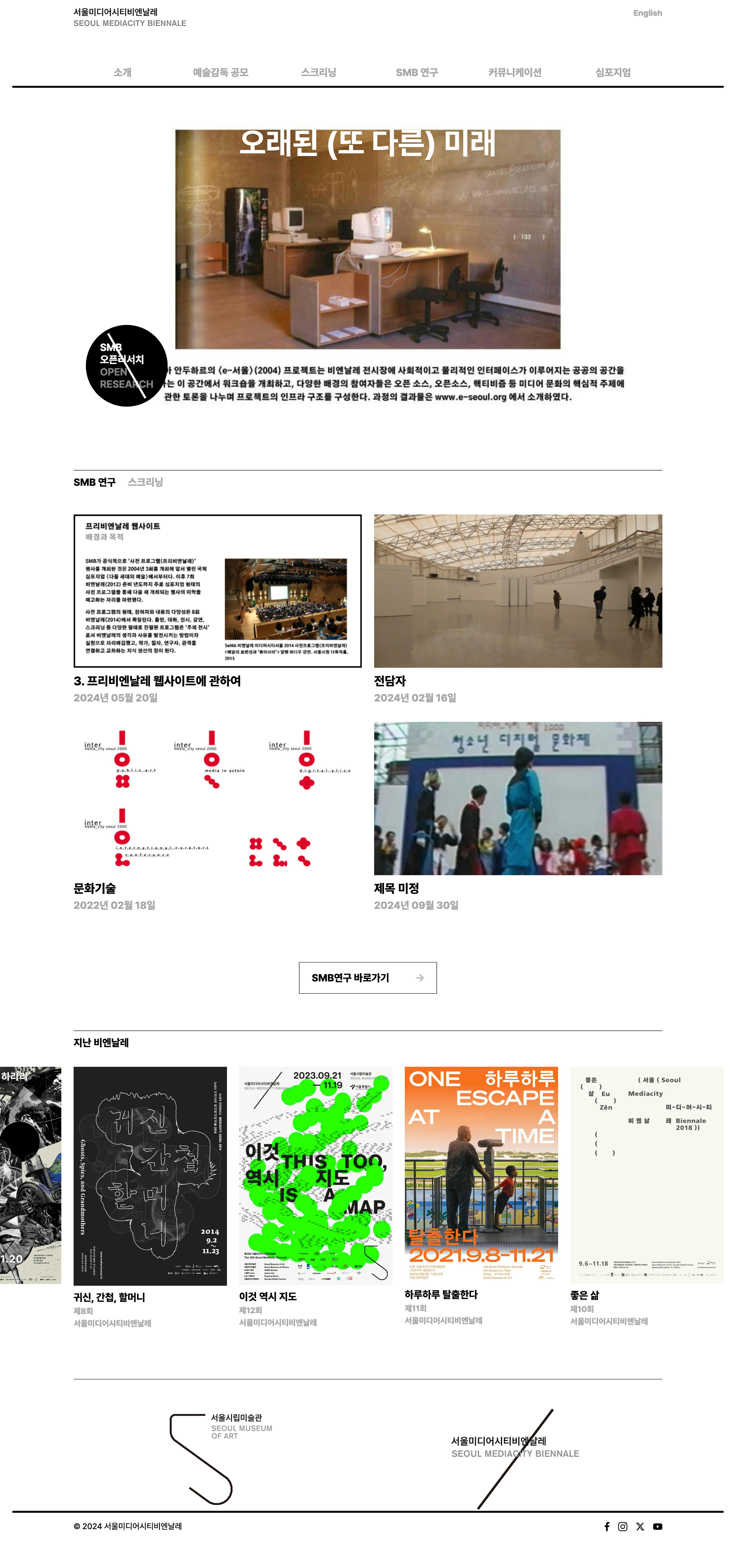 Since its inauguration in 2000 as an initiative of the Seoul Metropolitan Government, Seoul Mediacity Biennale has earned international recognition for its experimental engagement with contemporaneity and the changes of media in the city. The Biennale began sharing conceptual experiences on media beginning with its precursor exhibition SEOUL in MEDIA, which was held three times between 1996 and 1999. Since then, the Biennale has presented twelve editions, each embodying varying ideas and activities that resonate with its respective time. For each edition, some 50 participating artists (individuals and collectives) have presented works that respond to the project’s thematic focus and contend with the urgent issues of our time, attracting approximately 140,000 visitors during each Biennale period. Centered around Seoul Museum of Art Seosomun Main Branch, the Biennale also activates various satellite and collaborating spaces across the city of Seoul, accompanied by public programs and publications that serve as important mediators in fostering artistic awareness and experience among both participatory and audience members.