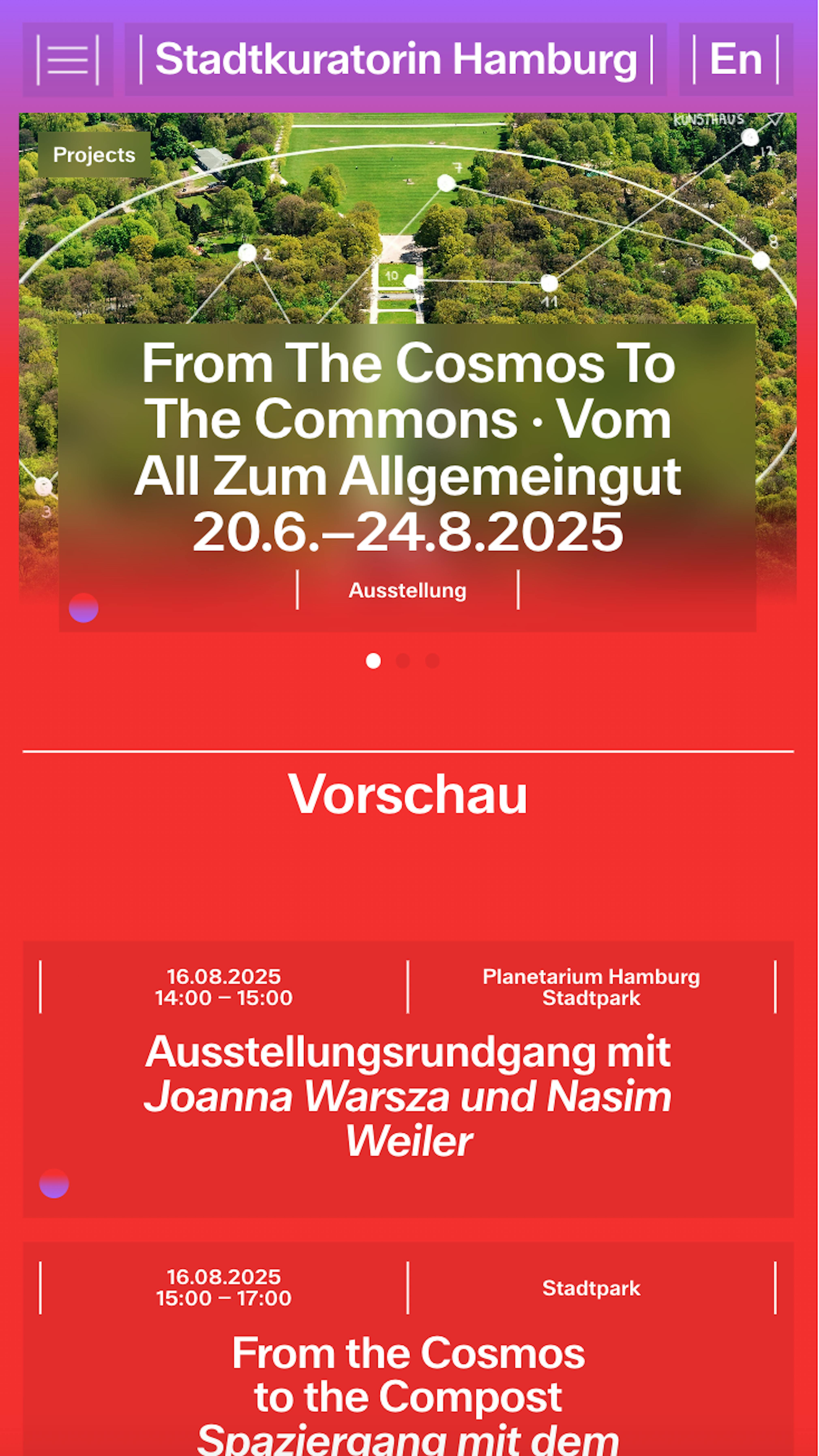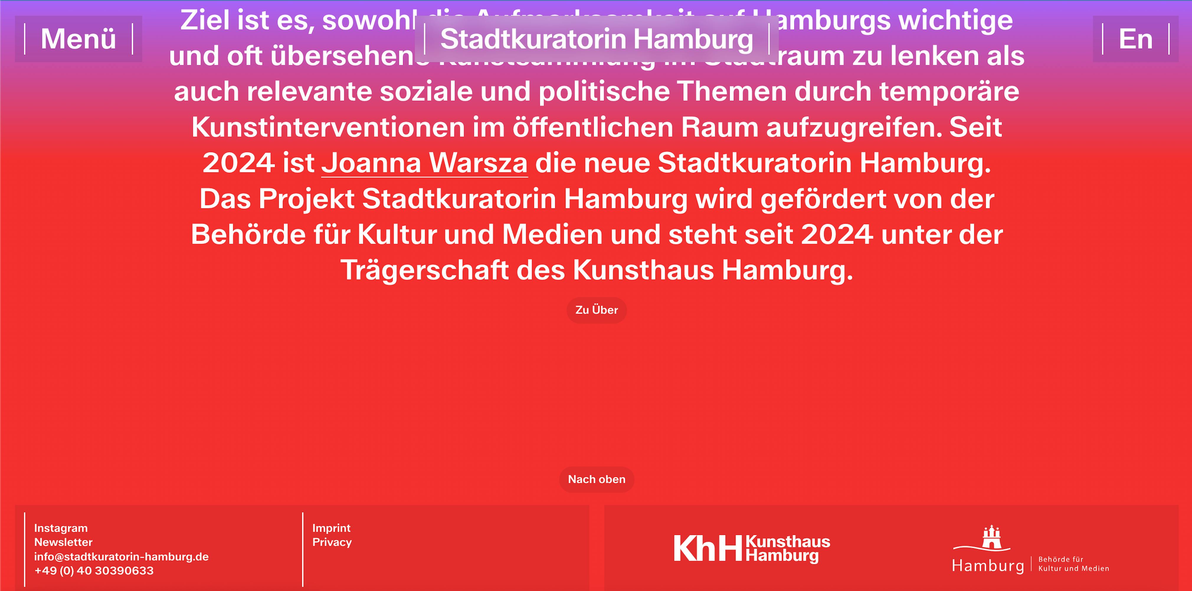 The City Curator is an independent curatorial format for public art that was initiated in Hamburg in 2013 and has since seen several follow-up editions both nationally and internationally. Its aim is to draw attention to Hamburg’s important and often overlooked collection of public art, as well as to address relevant social and political issues through temporary art interventions in public spaces. Since 2024, Joanna Warsza is the new City Curator of Hamburg. The project City Curator Hamburg is funded by the Ministry of Culture and Media Hamburg and has been hosted by the Kunsthaus Hamburg since 2024.