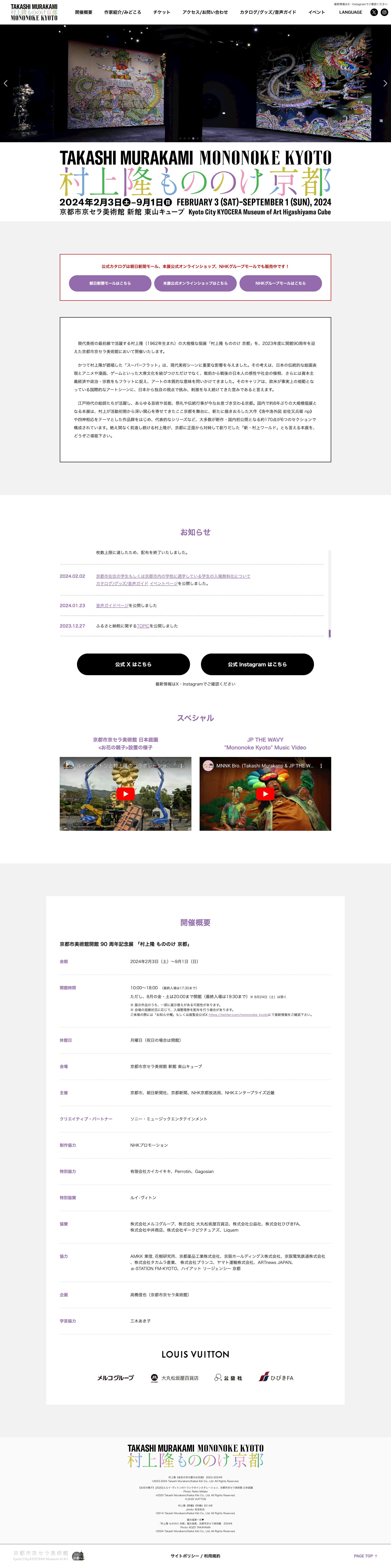 A large-scale solo exhibition of works by Takashi Murakami (b. 1962), an artist at the forefront of contemporary art, will be held at Kyoto City KYOCERA Museum of Art as it celebrates its 90th anniversary. For Murakami, who has developed his career primarily overseas, this will be his first large-scale solo exhibition in Japan in about eight years and his first outside of Tokyo. Please look forward to encountering a new world of Murakami in “Takashi Murakami Mononoke Kyoto,” an exhibition comprising around 170 predominantly new works including newly painted masterpieces, representative series, and works that will be exhibited for the first time in Japan.